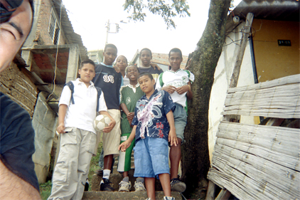Grupo de infantes posando a cámara en gradas entre viviendas. Allado izquierdo un camarografo gravando hacia cámara. Plano medio. Toma en contrapicado.