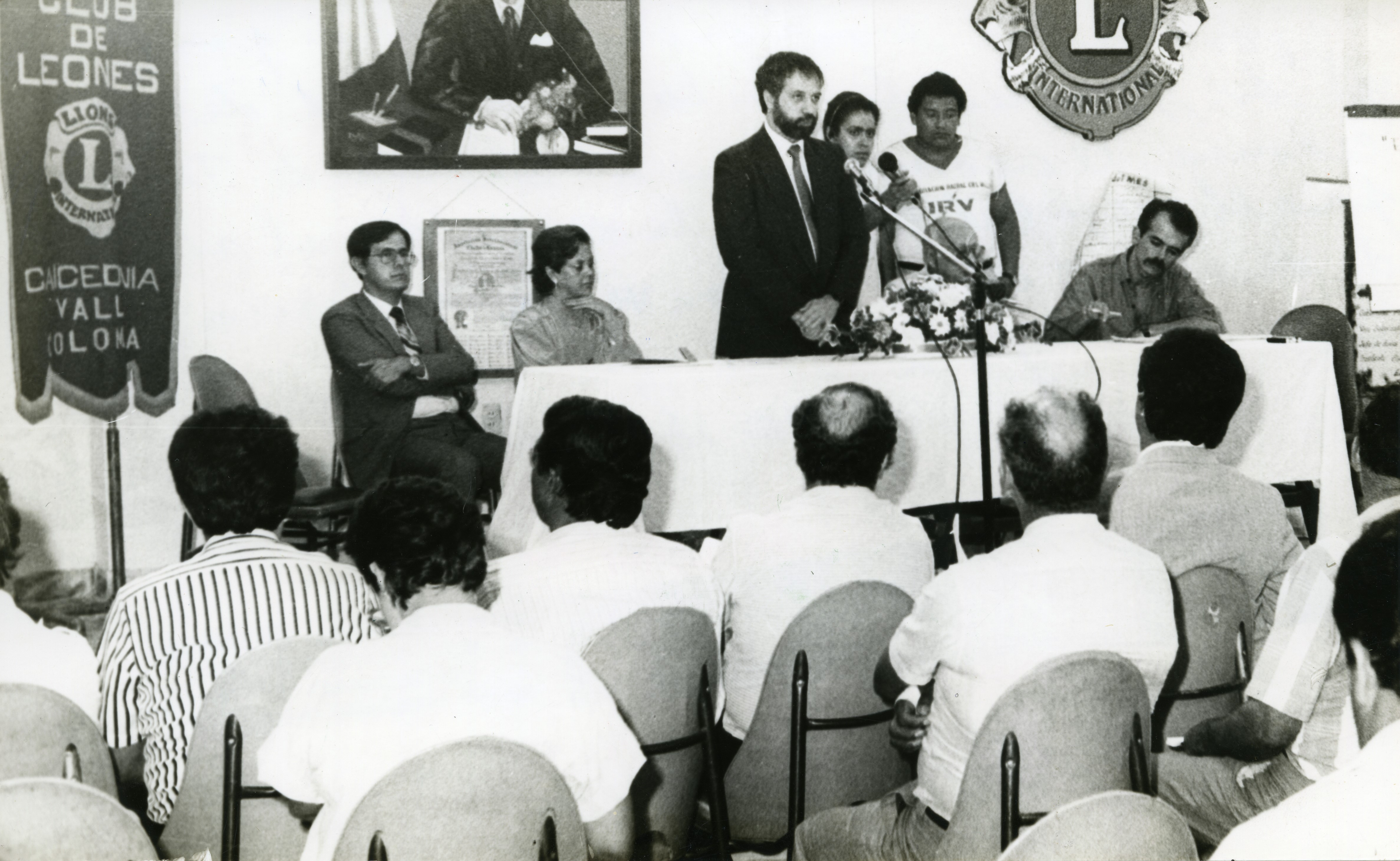 Al reverso de la fotografía se anexa el pie de foto del periódico: " Durante la jornada descentralista adelantada por el gobernador Manuel Francisco Becerra, se realizó en la sede del Club de Leones u interesante foro sobre los servicios públicos Participaron en este evento dirigentes políticos y cívicos de la ciudad y el gerente de Telecom para el viejo Caldas y norte del Valle y los alcaldes de Sevilla y Caicedonia.