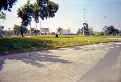 Plano general. Carrera 1 con calle 52. Glorieta en la cual se encuentra el monumento al deporte. En el plano medio un hombre corta el prado. En el plano medio sombra producida por árbol fuera de campo.