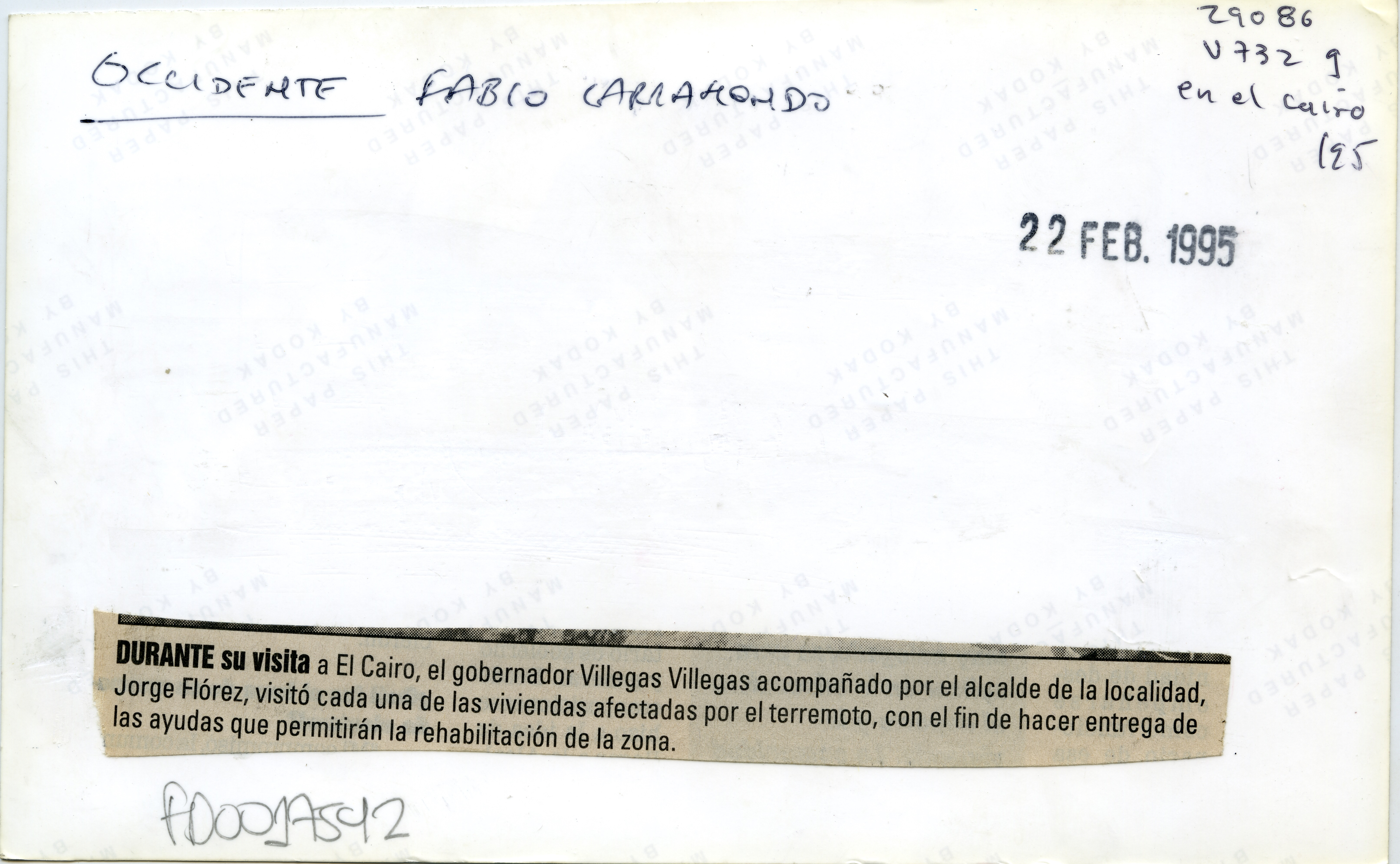 Gobernador Germán Villegas con la comunidad. Al reverso de la fotografía se anexa recorte: Durante su visita a El Cairo, el gobernador Germán Villegas Villegas acompañado por el alcalde de la localidad, Jorge Flórez, visitó cada una de las viviendas afectadas por el terremoto, con el fin de hacer entrega de las ayudas que permitirán la rehabilitación de la zona