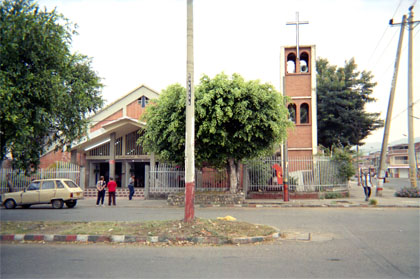 Plano general. Exterior día. Toma frontal Iglesia San Juan Bautista. Realce de cubierta piramidal y torre con arcos dobles.