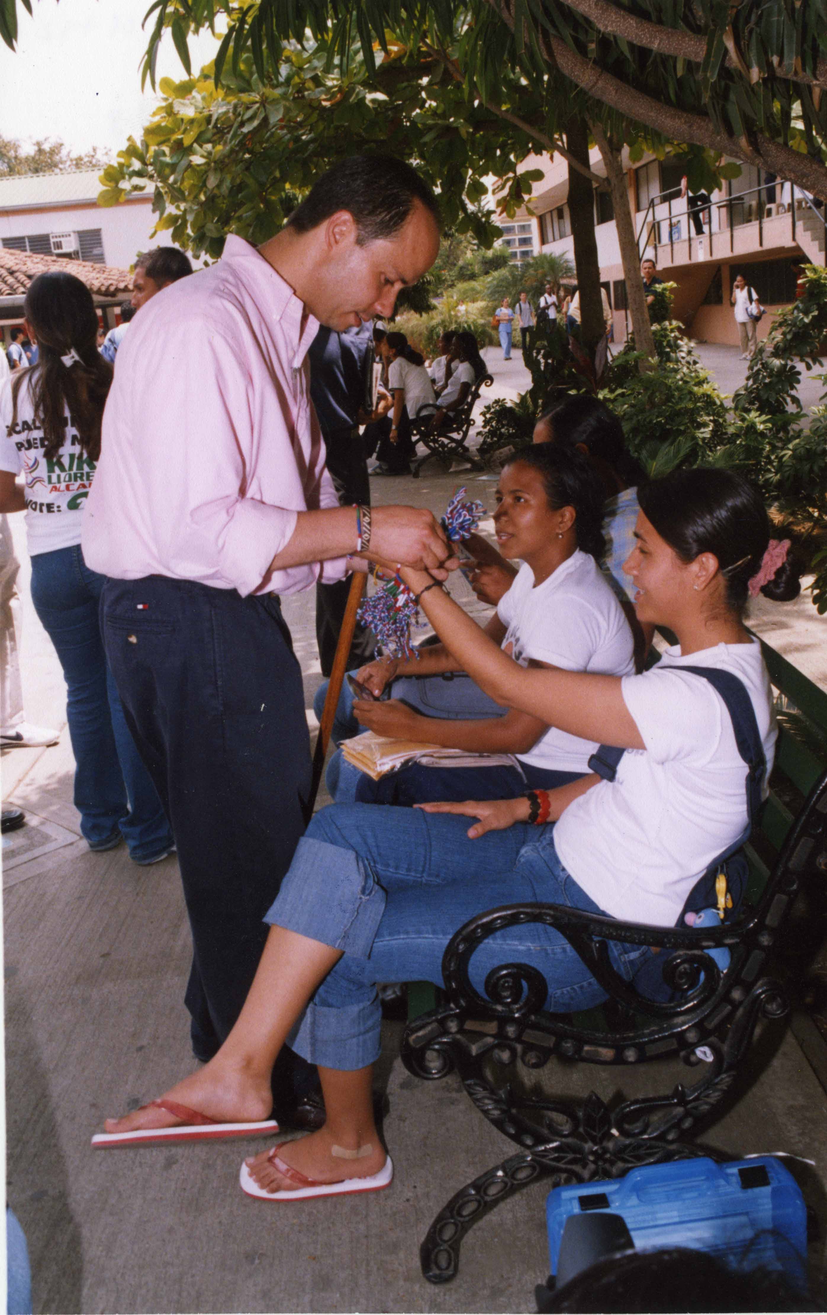 En el pie de foto dice lo siguiente: Francisco José "Kiko" Lloreda se convirtió en un especialista en color manillas del color de la Bandera de Cali, el simbolo de su campaña. Decenas de ellas fueron puestas a lo largo de esta cruzada por el respaldo en las urnas--El Archivo del Patrimonio Fotográfico y Fílmico del Valle del Cauca es responsabilidad de la Biblioteca Departamental del Valle Jorge Garcés Borrero, por convenio de cooperación suscrito con la Secretaria del Cultura Departamental, con el fin de aunar esfuerzos para su conservación, preservación y divulgación del Archivo entre la comunidad Vallecaucana, especialmente entre los estudiantes e investigadores que visitan la Biblioteca, propiciando el su uso y consulta permanente. La universidad Icesi es un colaborador en el proceso de difusión, facilitando la tecnología que permite la consulta de las imágenes.
