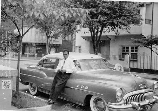 El Señor Marino Hernando Medina al pie de su lujoso coche, en el barrio Granada. Santiago de Cali, 1953