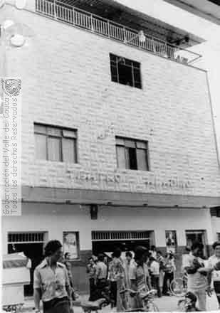 Los antiguos teatros de nuestros pueblos fueron de vital importancia como una forma más para romper la cotidianidad y la ampliación de las formas culturales de recreaciación. En la foto el teatro "Aladino" en Caicedonia. 1972.