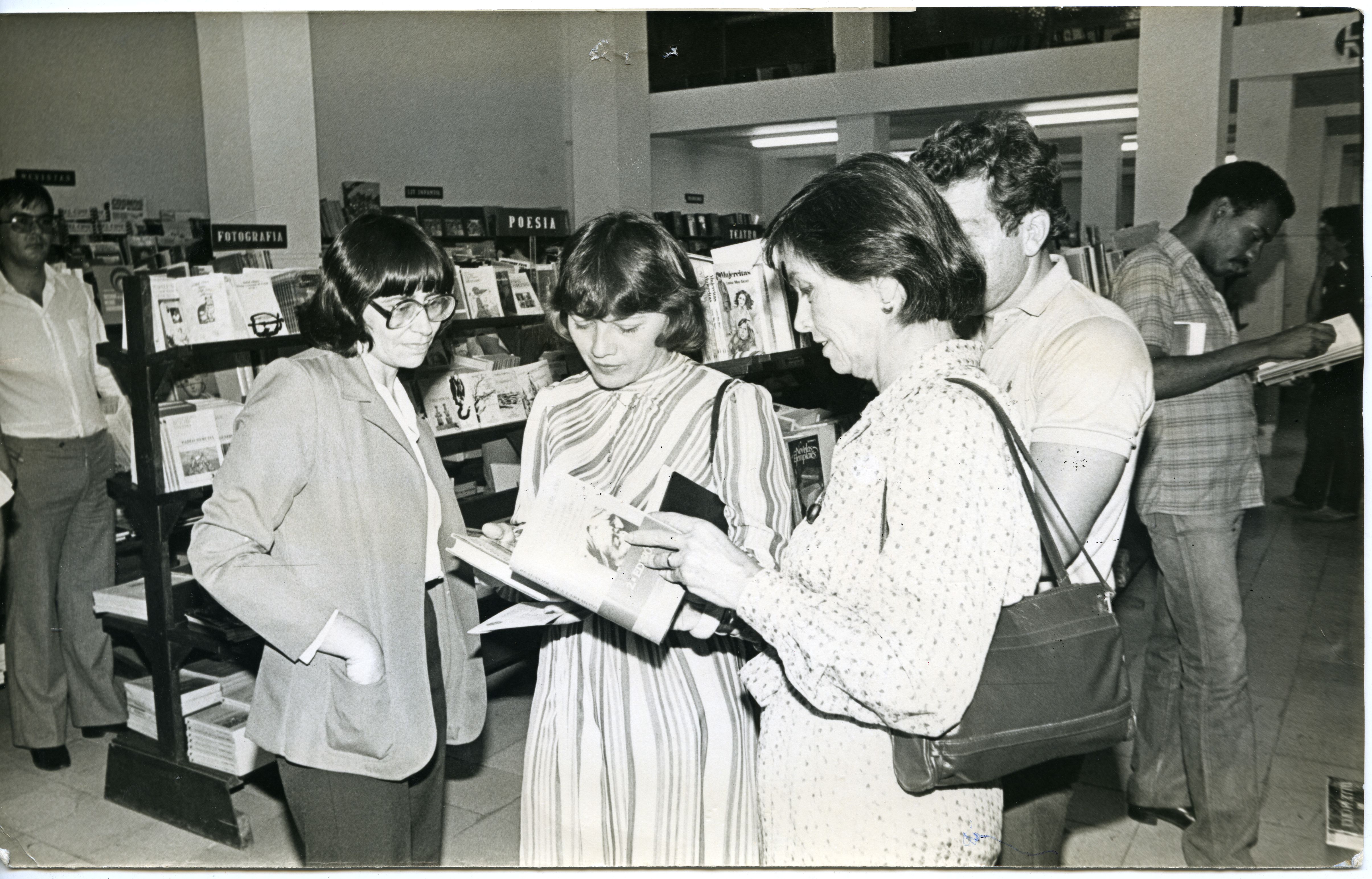 Foto de la reciente donación de colecciones por parte de la Librería Nacional, a la Biblioteca Departamental, quienes reciben a nombre del Gobierno son, la entonces gobernadora del Valle, Doris Eder de Zambrano y la entonces directora de la Biblioteca Departamental, María Victoria González de Gómez.