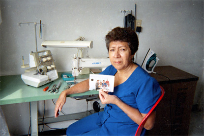 Plano medio. Imagen de la madre del autor. En su mano izquierda sostiene una foto de sus tres hijos. Al fondo máquina de coser con la cual la señora se gana su sustento.