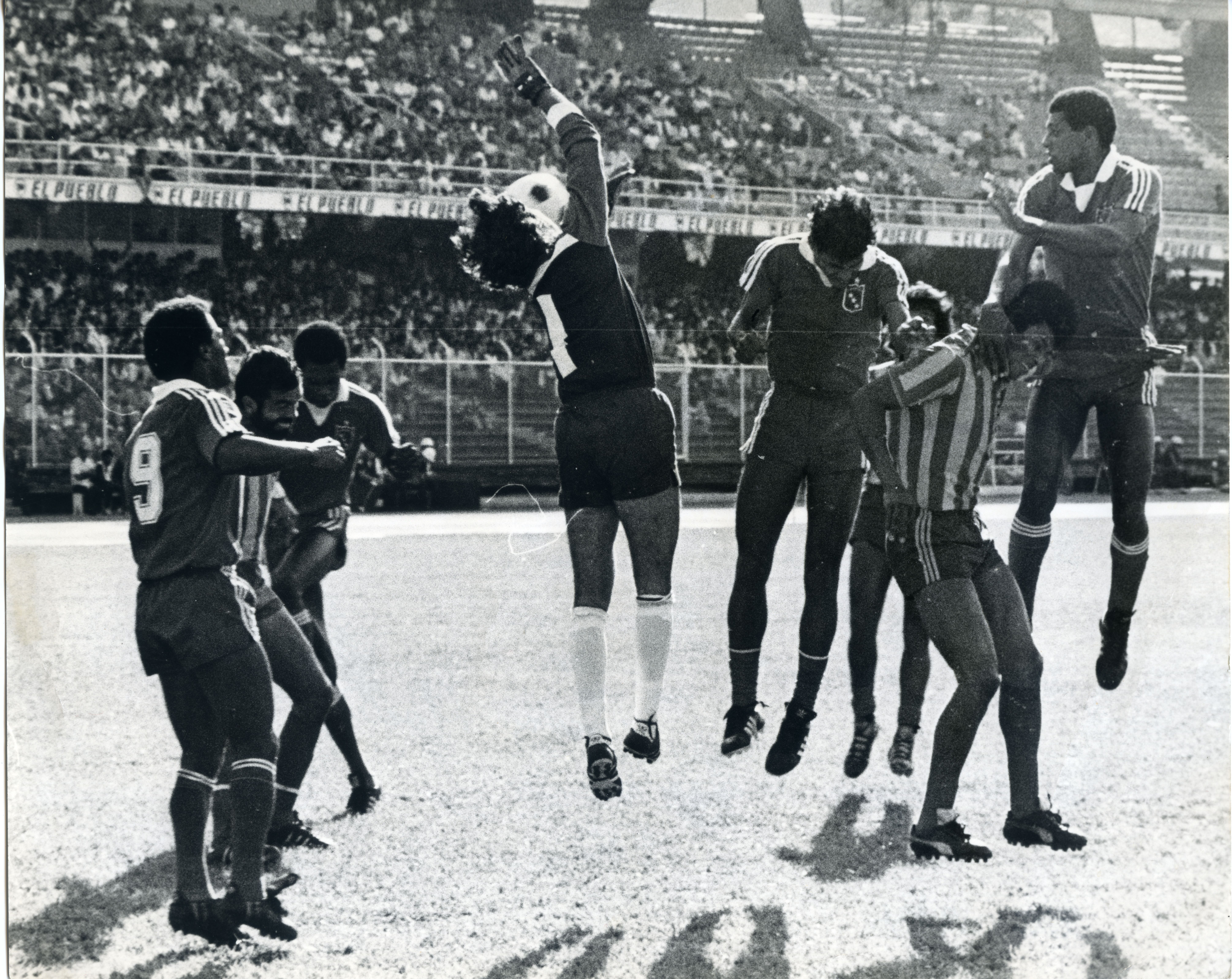 Fotografia de plano completo de jugadores del America y Pereira, donde se aprecian cuatro jugadores saltando, el arquero se ve por el aire con las manos estiradas en busca del balon, detras del arquero se ve un jugador Americano con el numero nueve en sus espaldas
