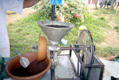 Primer plano de molino de café, sobre fondo exterior donde reposa planta florecida y fragmento de bicicleta. Realza pierna izquierda del vendedor en costado izquierdo.