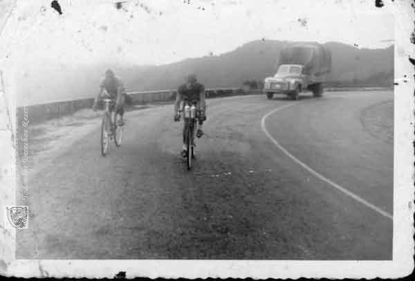 Regulo y Pedro Sánchez, deportistas, entrenando en la vía al mar. Santiago de Cali, fecha aproximada, 1970