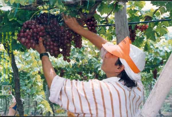 Agricultor recogiendo las uvas, viñedos Grajales. La Unión, C. 1995.