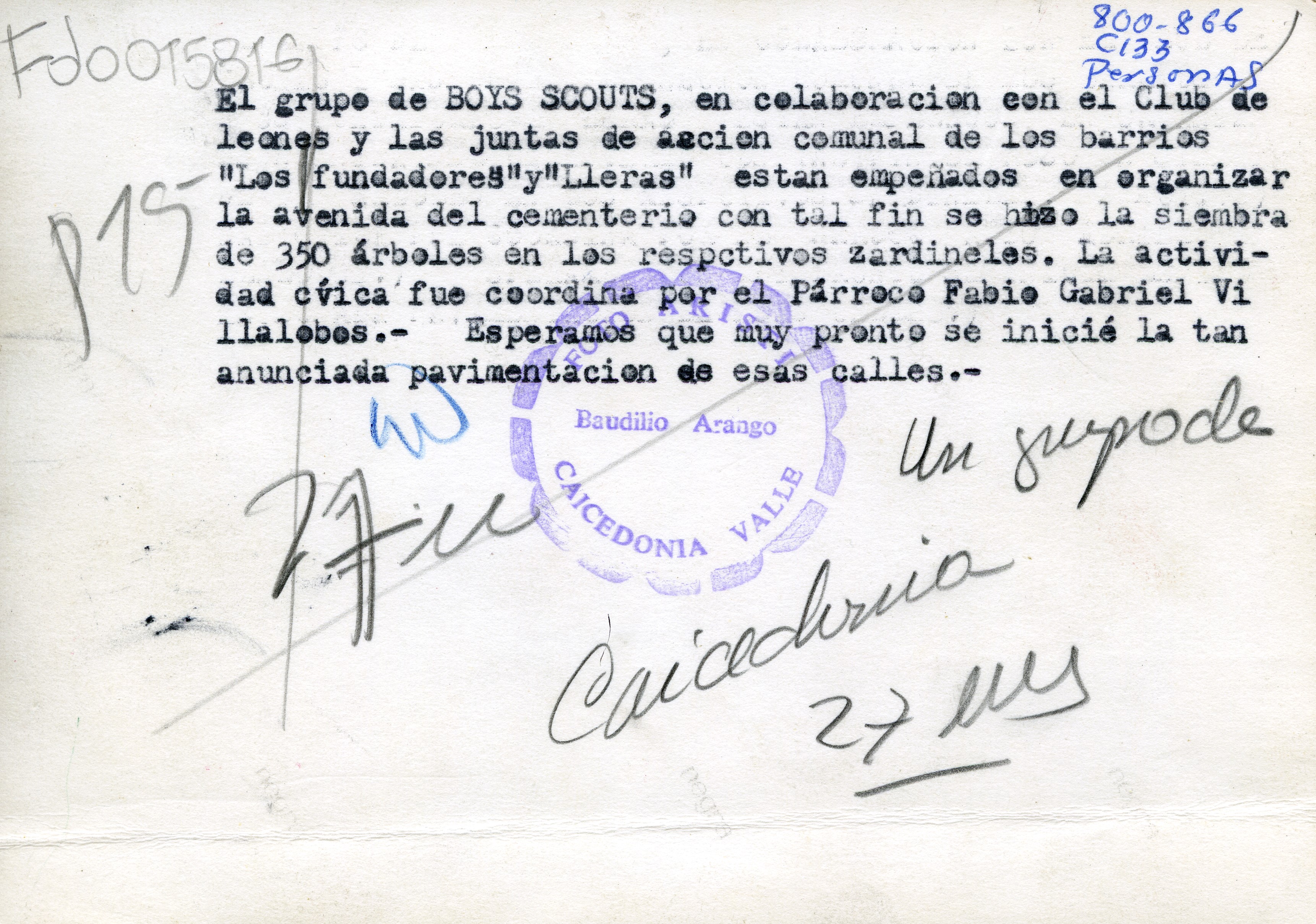 Al reverso de la fotografía se anexa el pie de foto del periódico: El grupo de BOYS SCOUTS, en celebración con el Club de Leones y las juntas de acción comunal de los barrios "Los Fundadores" y "Lleras" estan empeñados en organizar la avenida del cementerio con tal fin se hizo la siembra de 350 árboles en los respectivos zardinelas. La actividad cívica fue coordinada por el párroco Fabio Gabriel Villalobos. Esperamos que muy pronto se inicie la tan anunciada pavimentación de esas calles".