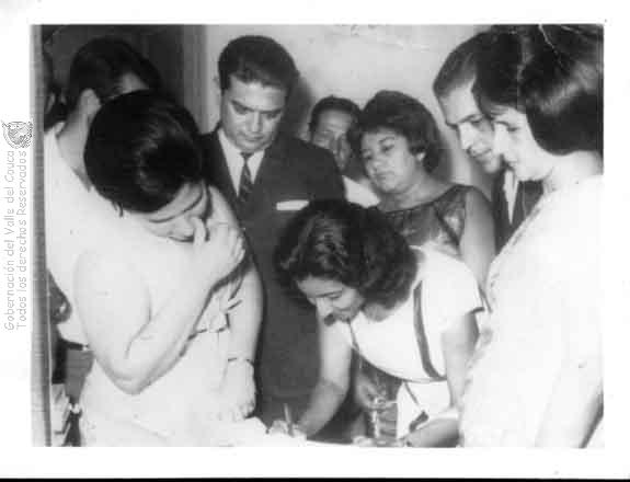 Firma del acta de poseción de la Alcaldesa de Roldanillo Nohemí González, entre los asitentes: Alina de Reyes, Libardo Madrid, Amaly de Silva, Alberto Erazo e Hilda Moreno. Zarzal, 1966.