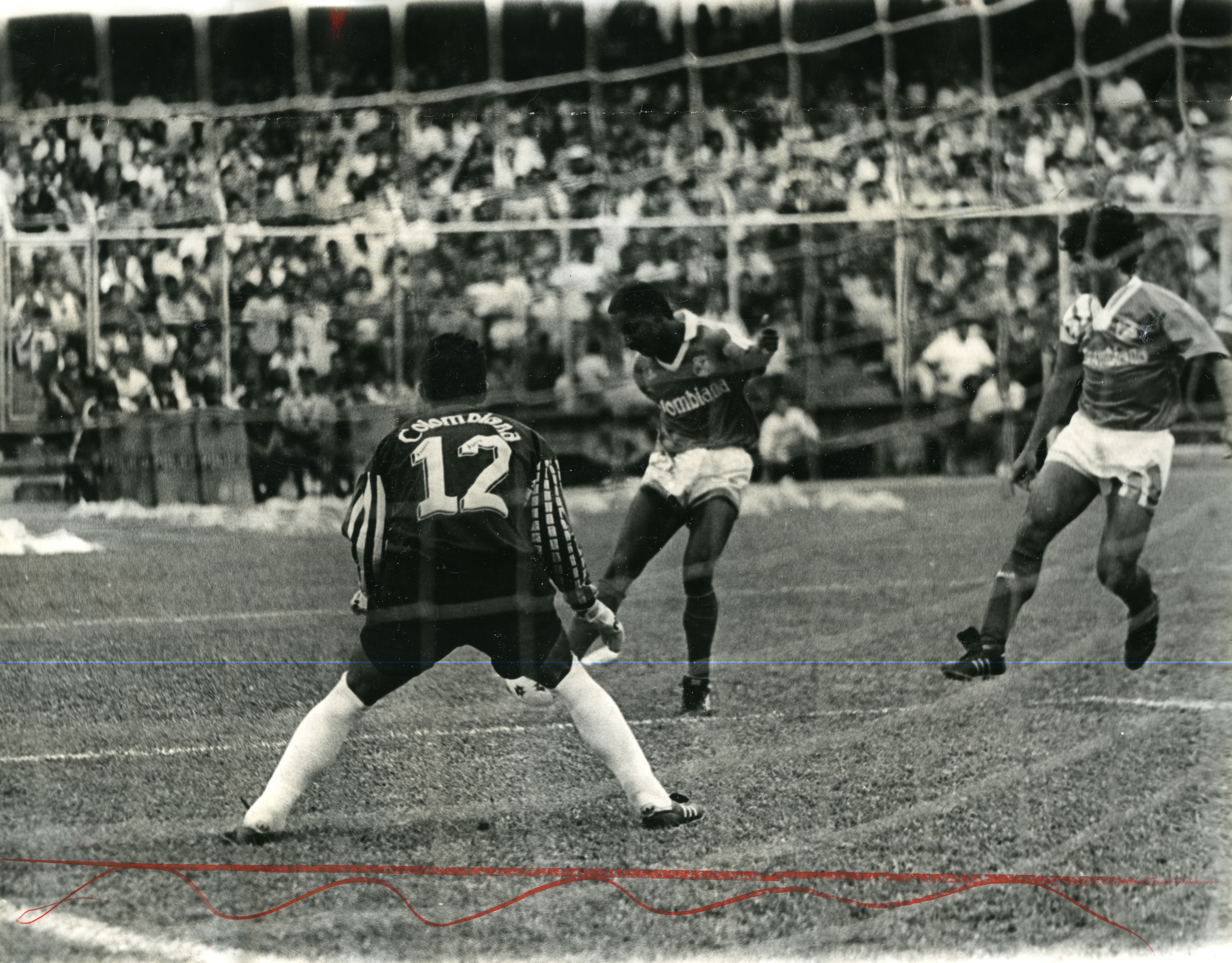Partido de fútbol del Deportivo Cali en el Olimpico Pascual Guerrero. Se aprecia a un jugador del equipo caleño rematar al arco.