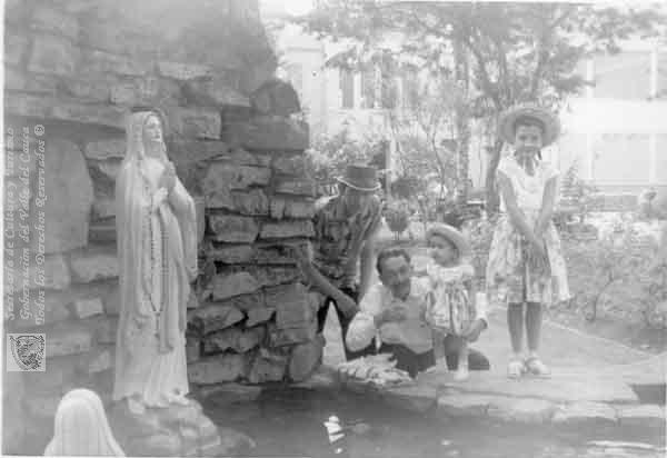 En la fuente de la virgen en el interior del Instituto Antonio José Camacho, la Familia Burbaro, el señor Zósimo y sus hijos Pedro Antonio, Nora y Natalia