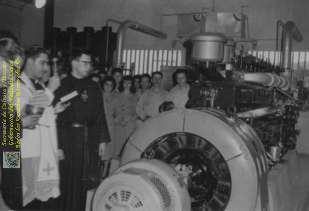 El cura párroco Jorge Porras hace la bendición de los motores de la planta de energía eléctrica en Caicedonia, 1960.