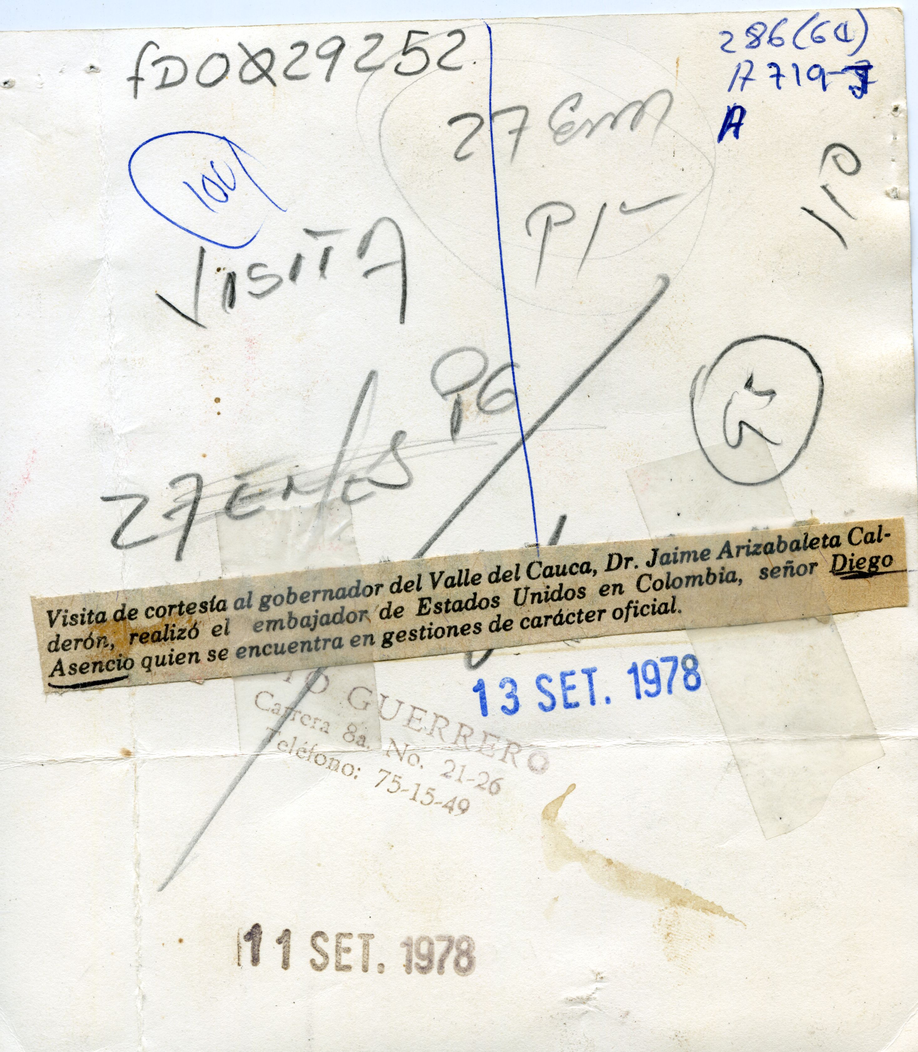 Jaime Arizabaleta Calderón fue gobernador del valle en el periodo del 1 de septiembre de 1978 al 11 de septiembre de 1980. Perteneció al partido Liberal Colombiano. Se observa Jaime Arizabaleta, estrechando la mano de diego Asencio, embajador de estados unidos en Colombia quien se encuentra en gestiones de carácter oficial.