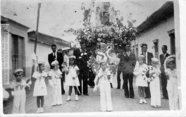 Celebración de proseción de la Virgen de Nuestra señora de Chiquinquirá por las calles de El Cerrito. C. 1950.