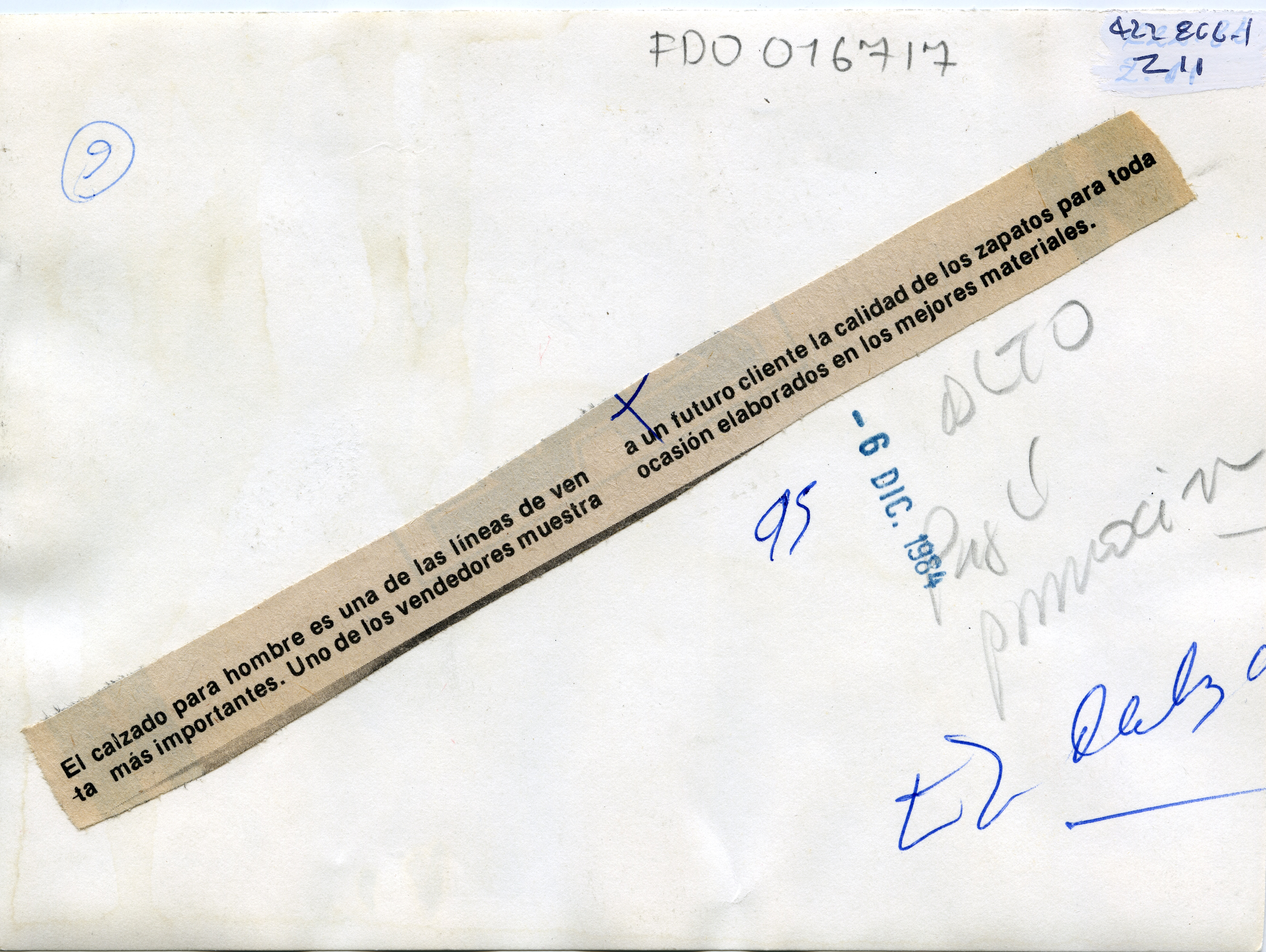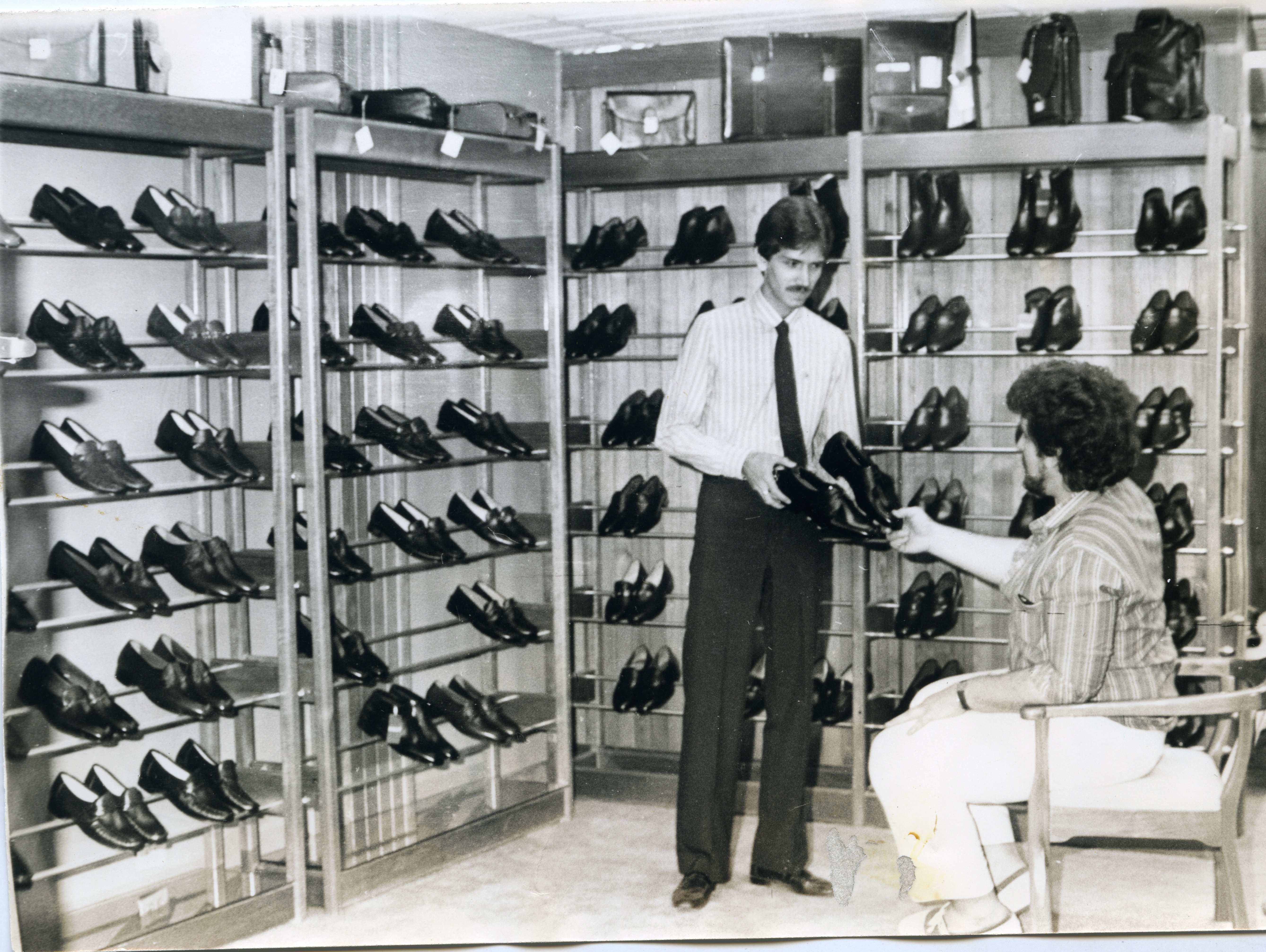 Al reverso de la fotografía se anex recorte: "El calzado para hombre es una de las líneas de venta más importantes. Uno de los vendedores muestra a un futuro cliente la calidad de los zapatos para toda ocasión elaborados en los mejores materiales."