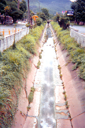 Plano general. En el centro de la imagen generando una perspectiva lineal canal recolector de aguas lluvias. Ubicado en la calle 52 separa los barrios La Merced y Los Álamos.