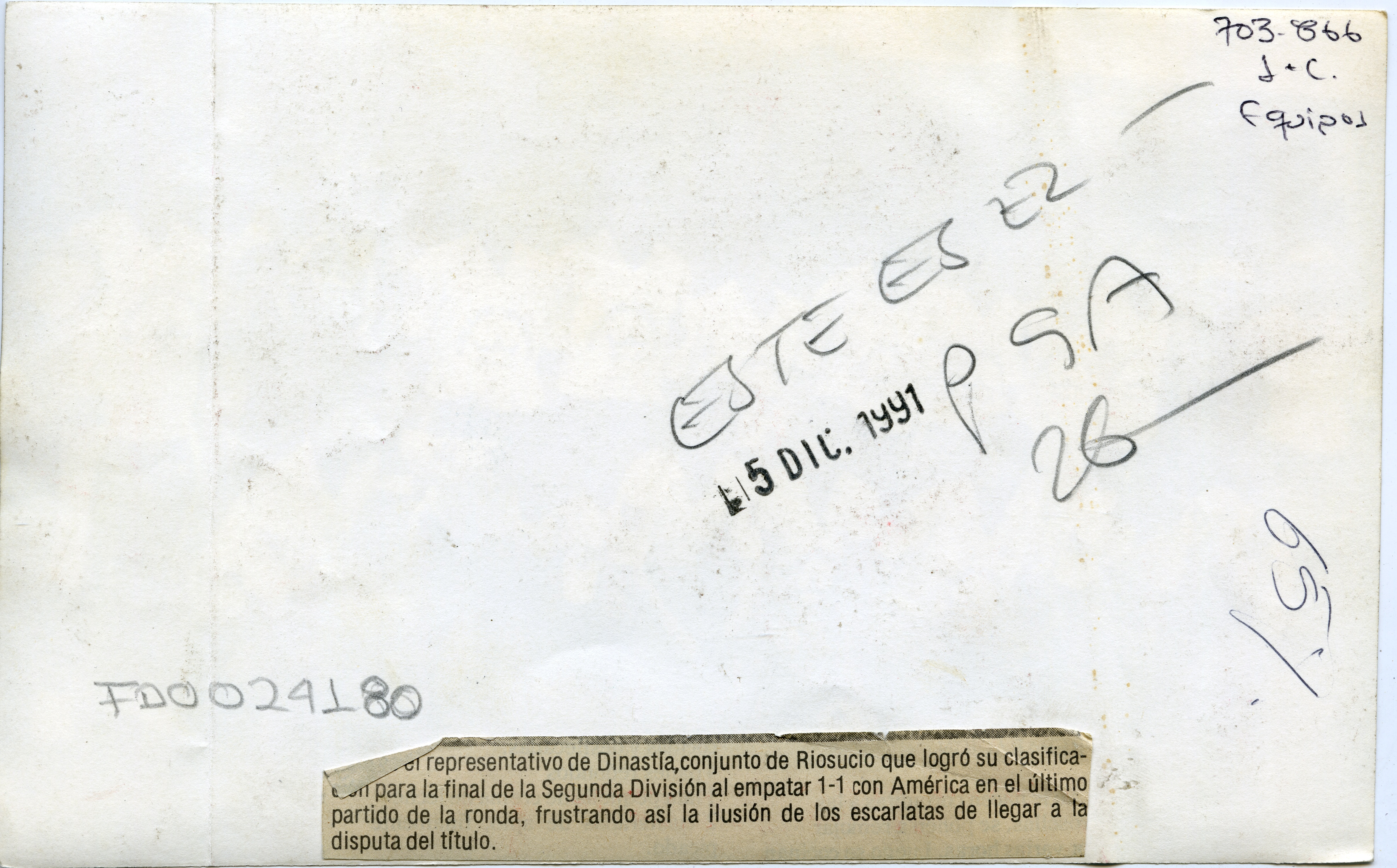 Al reverso de la fotografía se anexa recorte: Este es el representativo de Dinastía, conjunto de Riosucio que logró su clasificación para la final de la segunda división al empatar 1-1 con América en el último partido de la ronda, frustrando así la ilusión de los escarlatas de llegar a la disputa del título