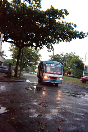 Plano medio. Imagen tomada en exterior, en un día lluvioso. Sobre una vía pavimentada se puede observar un bus de color azul, con las farolas encendidas. Al extremo izquierdo un árbol.