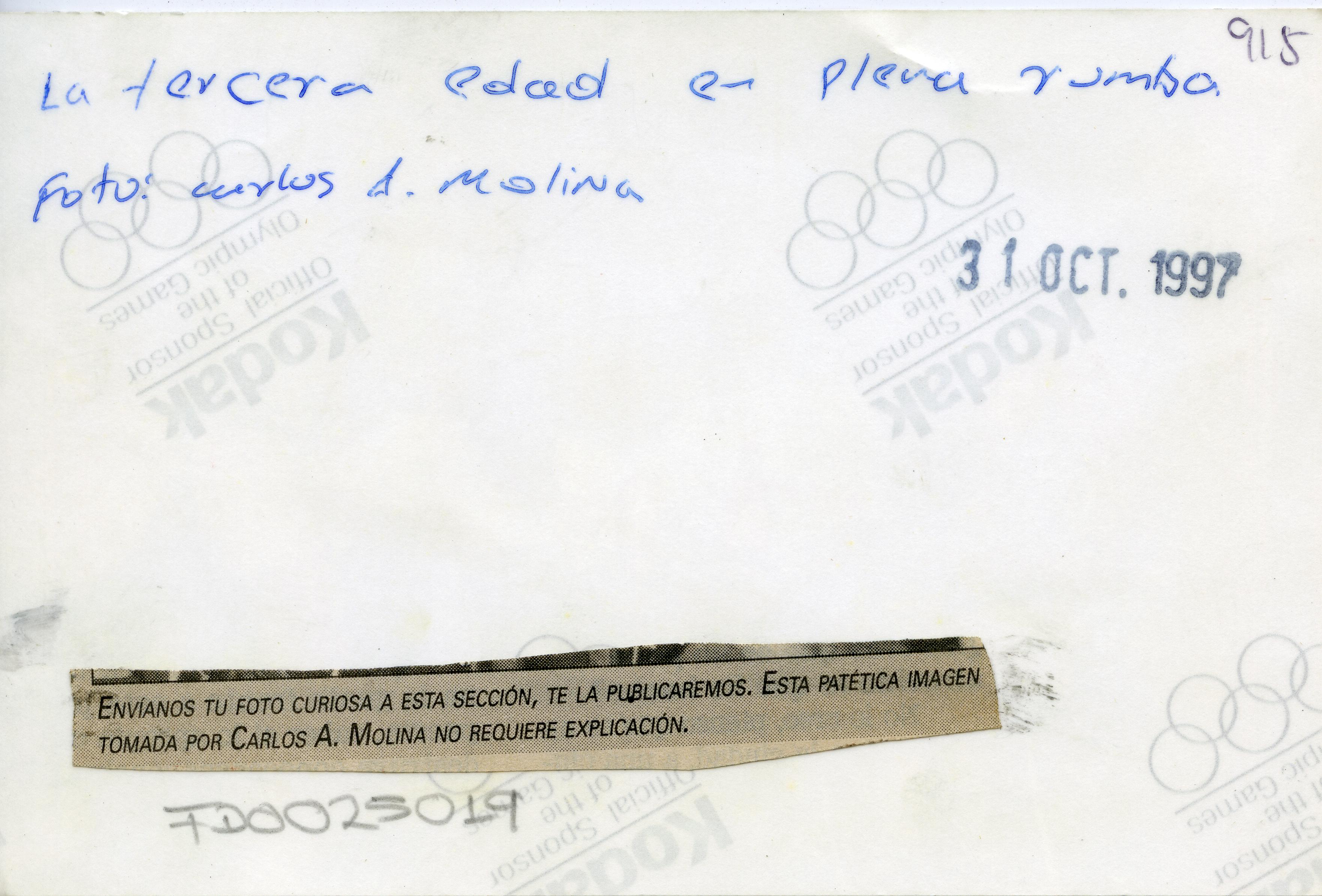 Al reverso de la fotografía se anexa el pie de foto del periódico: envíanos tu foto curiosa a esta sección, te la publicaremos. Esta patética imagen tomada por Carlos A. Molina no requiere explicación