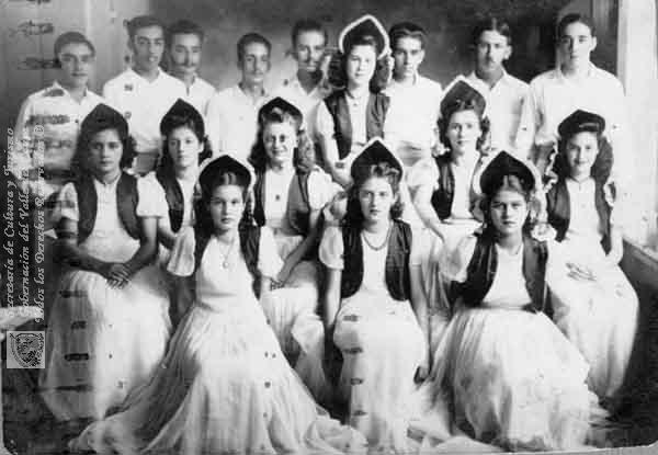 Mery Garcia,Marina Garcia, Alicia Maria F, Marina Llano, Ester Velasquez, Ernestina Aguado, Rosario Angel, y Consuelo Angel. Los acompañantes son jóvenes Cartagüeños, participan en la Comparsa del Festival de San Pedro y San Juan.