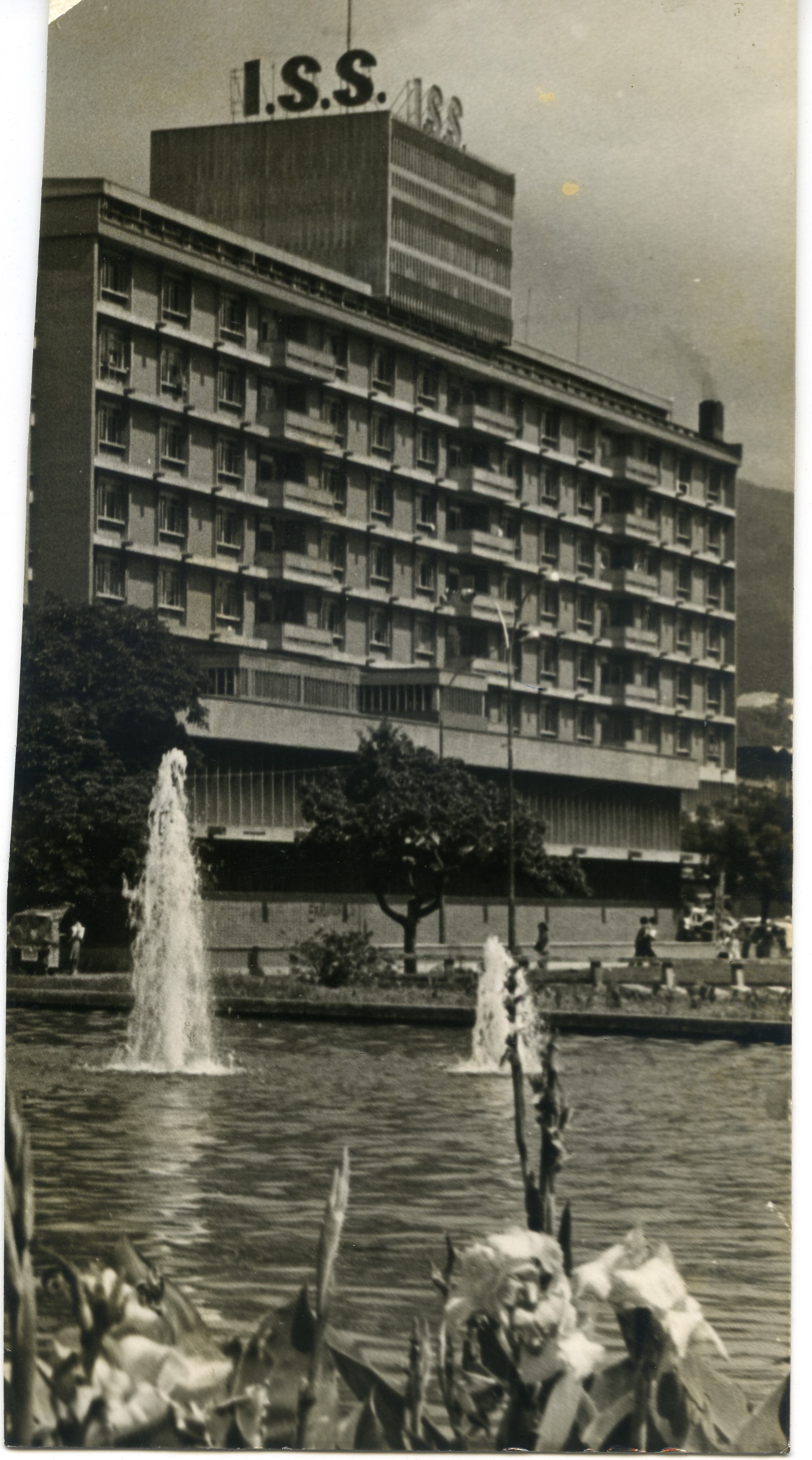 Se evidencia fuente de agua y al fondo fachada del Instituto de Seguro Social