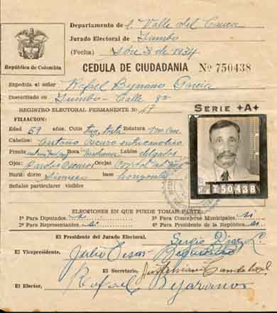 Cédula de Ciudadanía de los años treinta, perteneciente a Rafael Bejarano, los datos pertinentes eran llenados a mano. Yumbo, 1934.