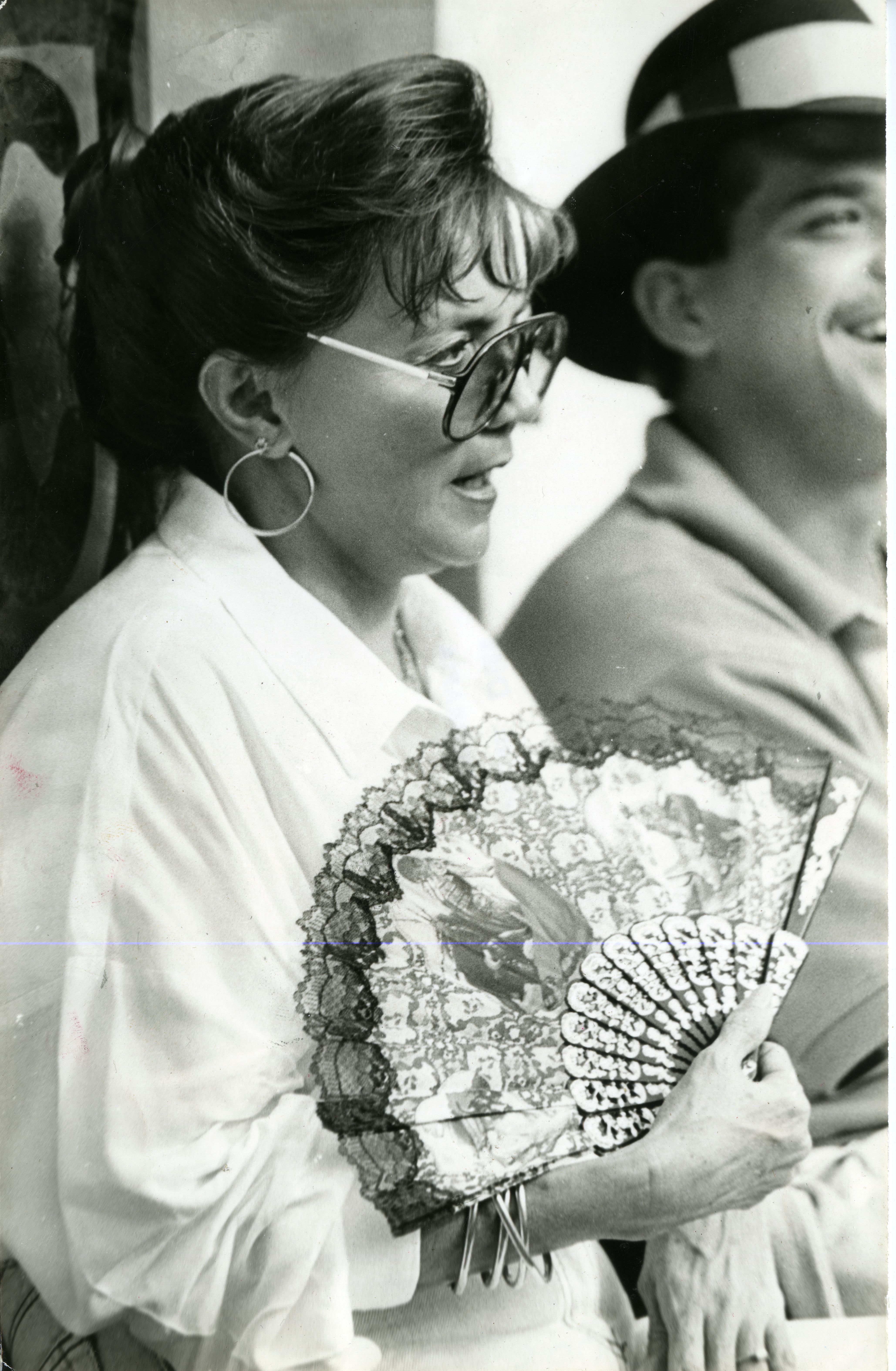 Plaza de Toros de Cañaveralejo. Inauguración con la primera corrida que se celebró el 28 de diciembre de 1957 con toros de la ganadería Clara Sierra que lidiaron Joselillo de Colombia, Joaquín Bernardo y Gregorio Sánchez. Se aprecia mujer con abanico y hombre sonriendo en la Plaza de Toros