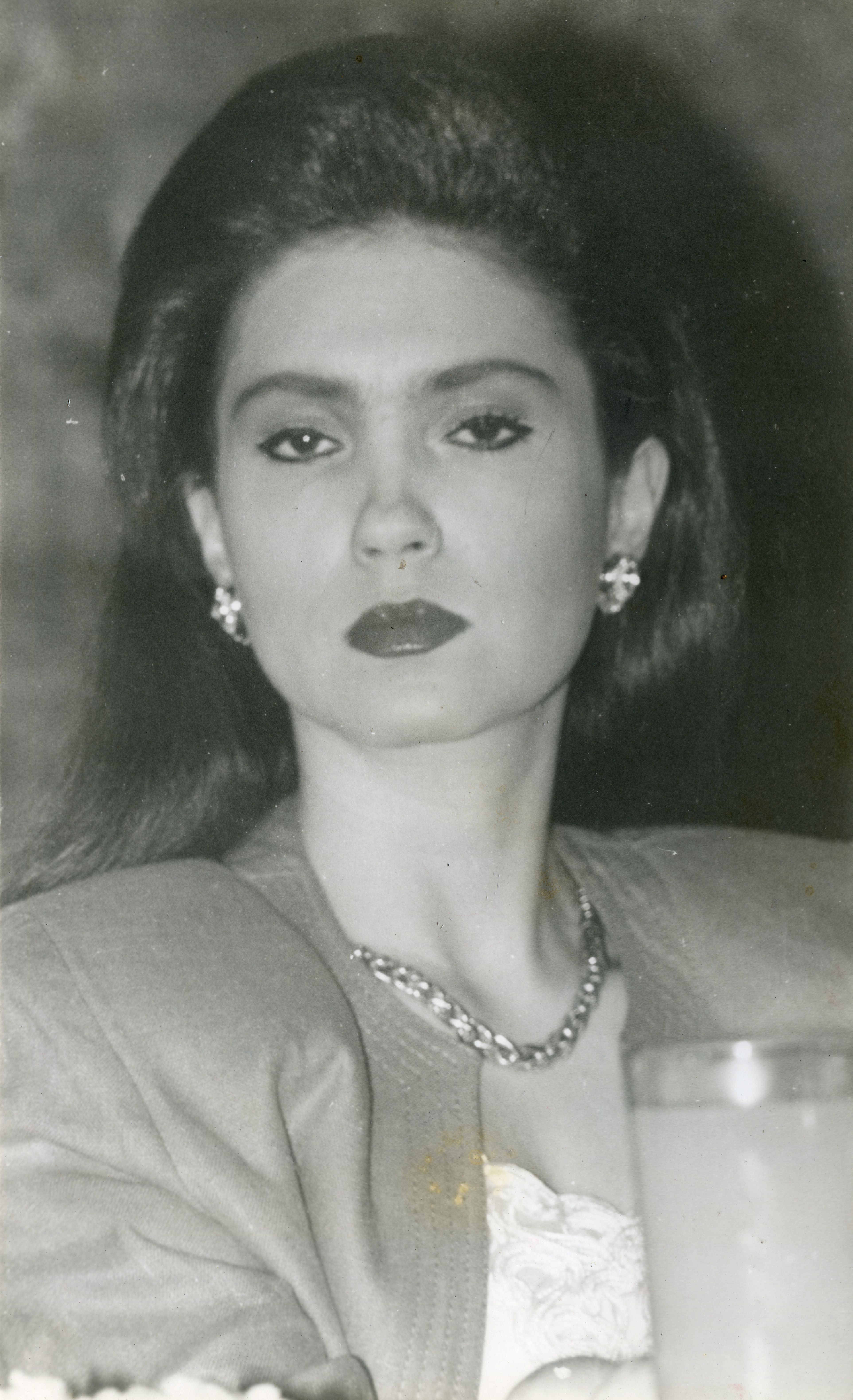 Fotografia de plano medio corto de una mujer la cual se ve con cabello largo y abundante, posa de frente y tiene en sus orejas aretes tipo topo, en su cuello se le ve una cadena.