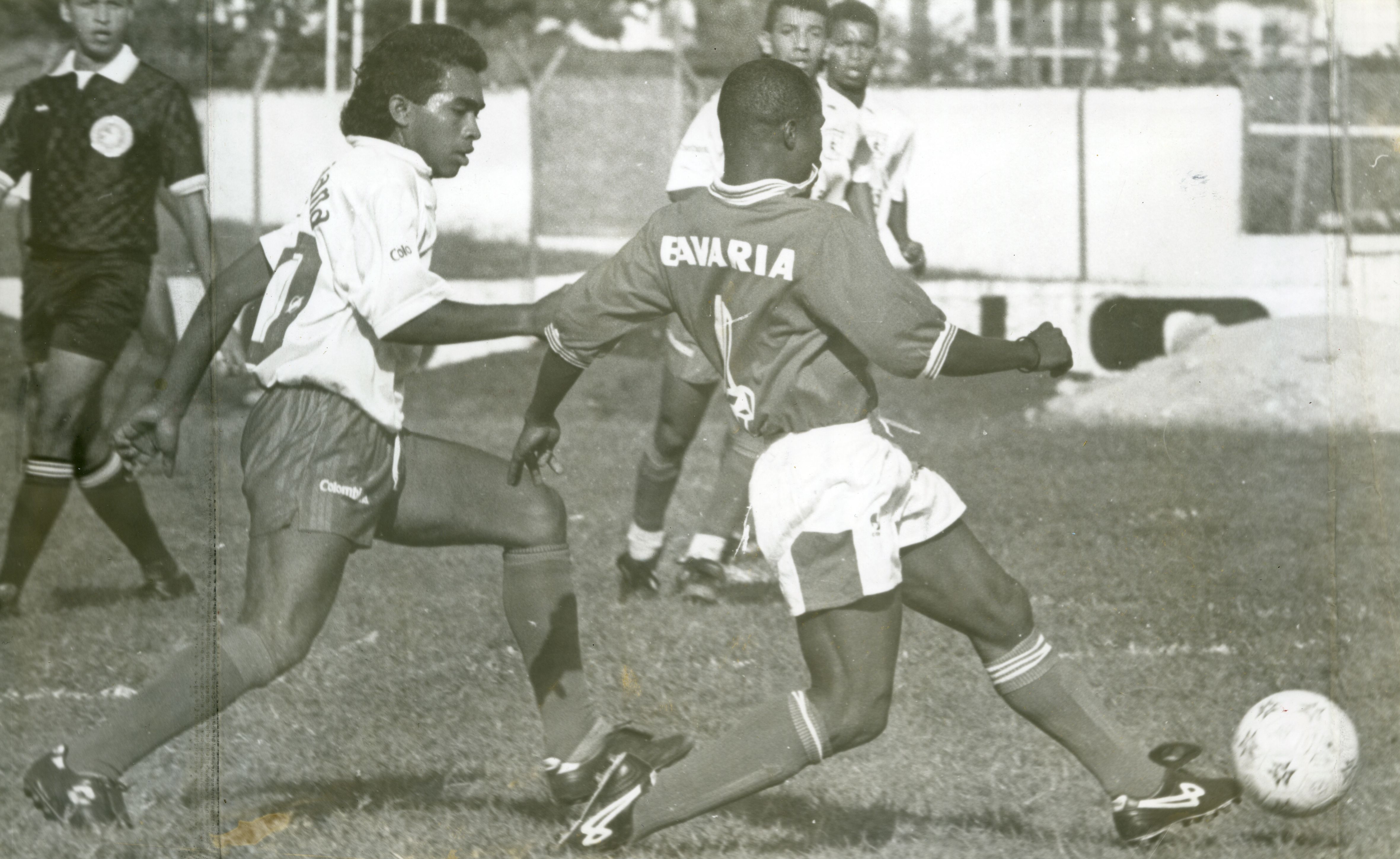 Integrantes de la Selección Valle sub-23 de fútbol de 1994, equipo de fútbol aficionado del departamento del Valle del Cauca. Observamos jugadores disputar el balón