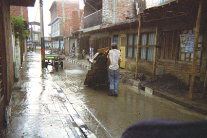 García Vélez, A. (2005). Imagen tomada en exterior, en un día lluvioso, donde se puede apreciar un hombre transitando por una vía pavimentada con una carretilla en madera, en la cual lleva algunos materiales reciclados. Santiago de Cali: Biblioteca Departamental Jorge Garces Borrero.