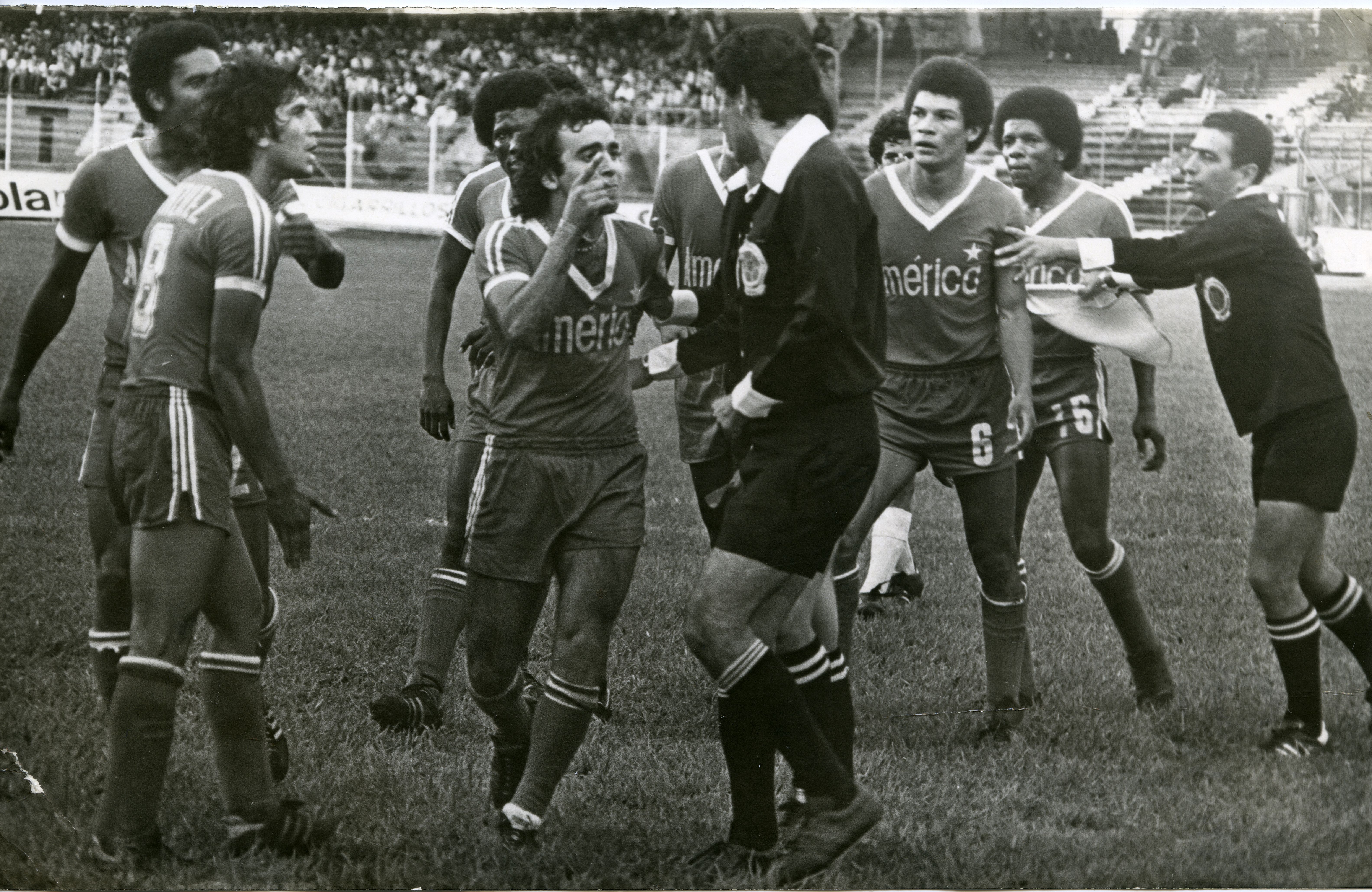Jugadores del América de Cali, discuten con el arbitro. Se aprecia a Juan Manuel Battaglia, Gerardo González Aquino, Víctor Lugo, Juan Caicedo, Ramiro Viáfara Quintana, entre otros