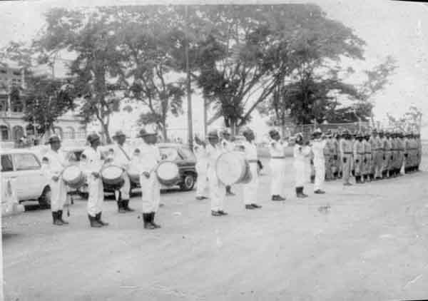Desfile de la banda y los miembros del Cuerpo de Bomberos del Terminal Marítimo de Buenaventura. 1966.