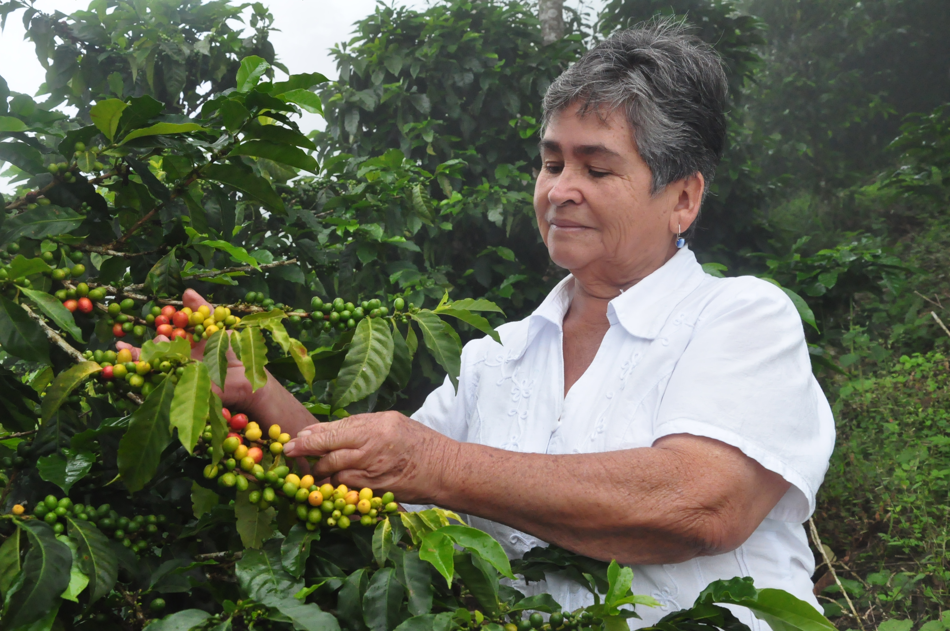 Caicedonia, Valle del Cauca. Fundado en 1905, por Daniel Gutiérrez, Jorge Moreno, Zenón Baena. Municipio desde 1923. Economía importante en agricultura, caficultura, ganadería, mineral, comercio, industria, entre otros. Atractivo turístico: cerro de cubides, club de tiro, caza y pesca, río barragán, paraje natural, lagos. Observamos en la imagen, mujer caficultora en recolección de café