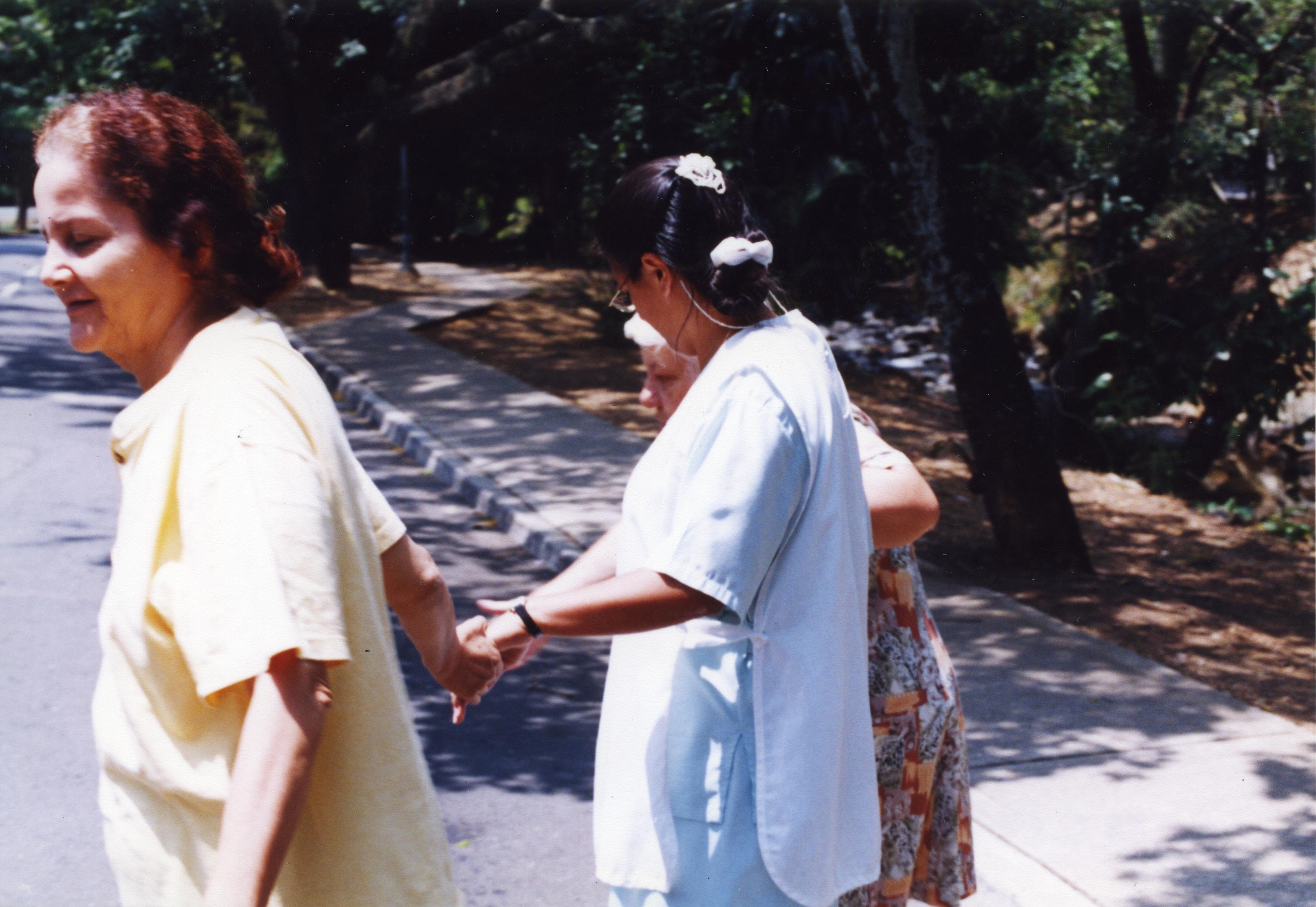 En la gráfica se aprecia enfermera ayuda abuelas a cruzar la calle