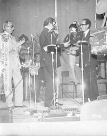 Eevtno cultural en el Colegio La Inmaculada. Grupo musical integrado por Luis Mario Medina, Camilo Reyes y Jorge A. Morales, entre otros. ginebra. C. 1970.