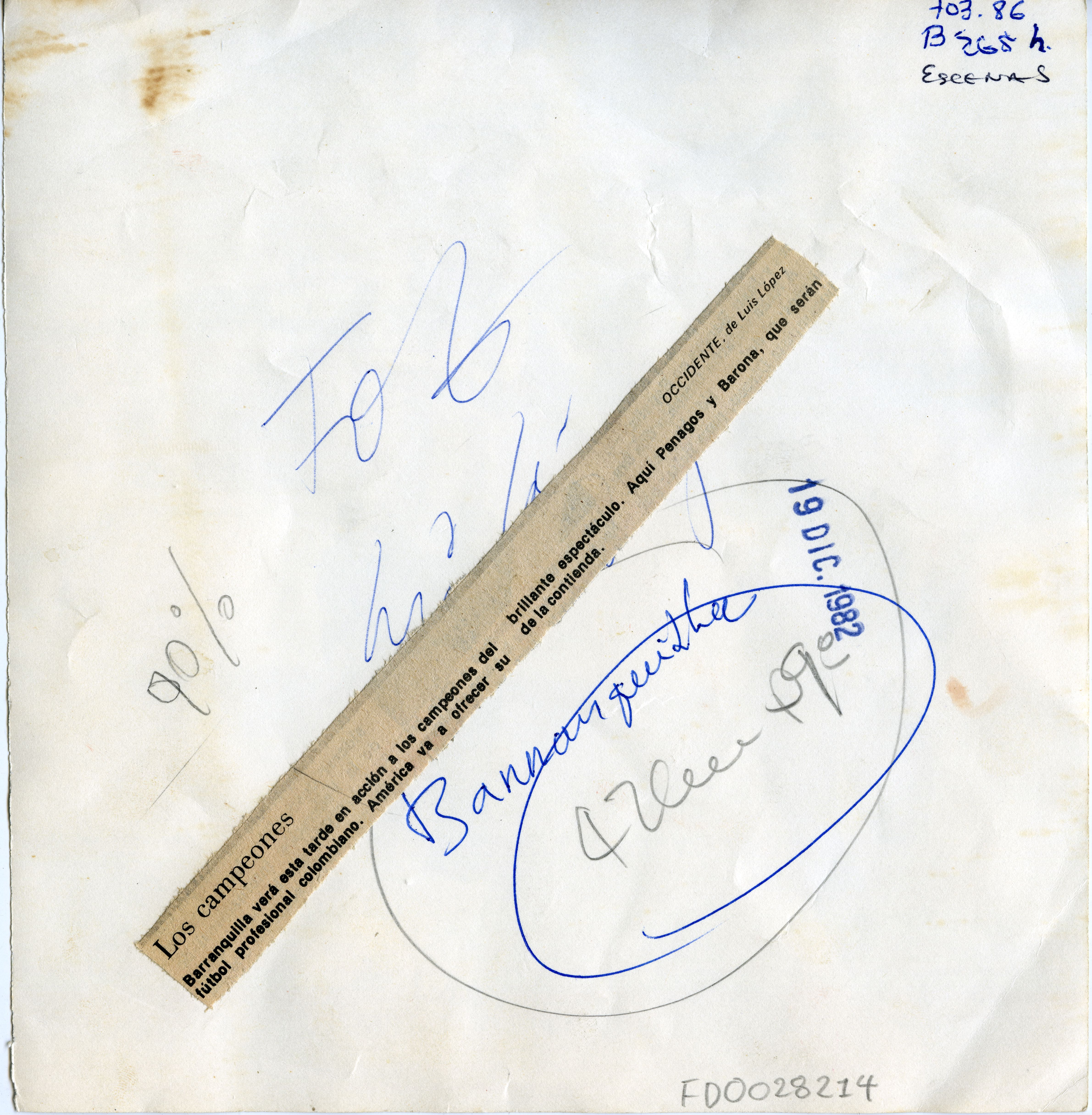 Reverso:"Los campeones. Barranquilla verá esta tarde en acción a los campeones del futbol profesional colombiano. América va a ofrecer su brillante espectáculo. Aquí Penagos y Barona, que serán de la contienda."