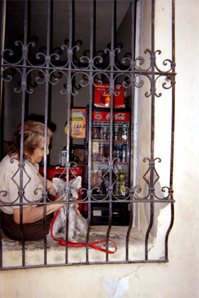 Plano medio. Mujer con perro. Detalle de reja en primer plano.