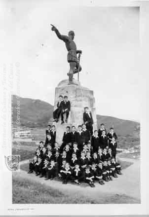 Estudiantes del Colegio San Luis Gonzaga, posando junto a la estatua de Sebastian de Belalcazar. Santiago de Cali, 1.948