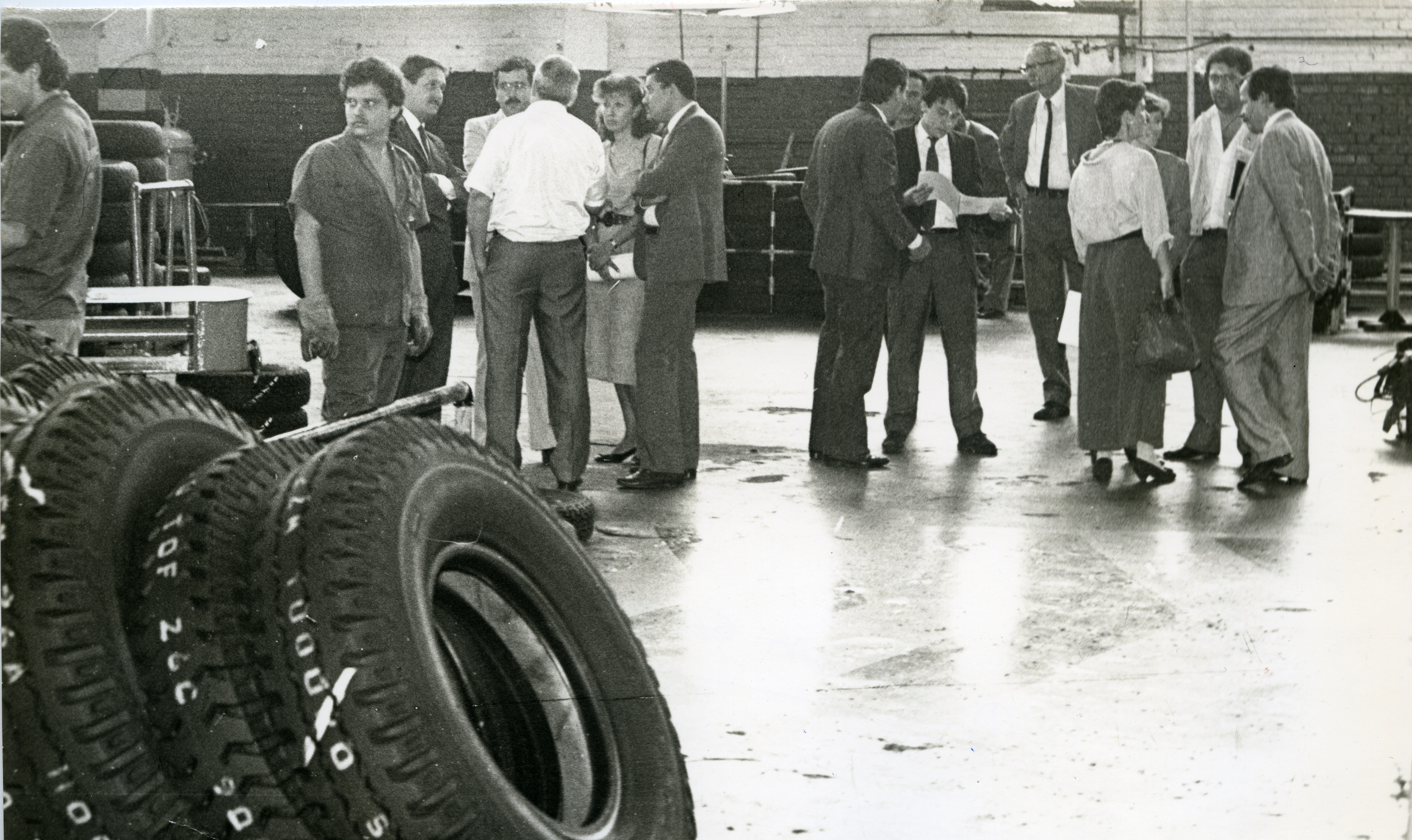 Visita en la planta de empleados. Observamos un grupo de personas. Se aprecia llantas. Nota en manuscrito reverso de la foto: Foto William Gaviria. Llantas