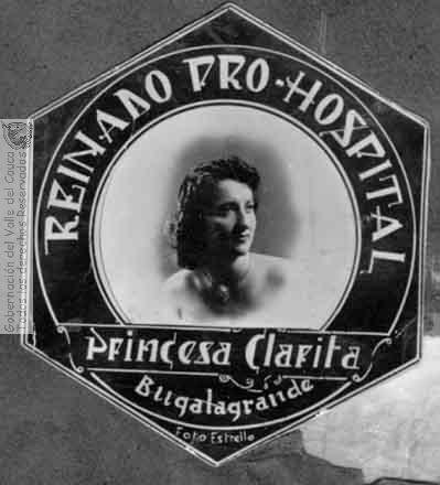 La imágen contiene un texto que Dice:"Reinado pro-hospital. Princesa Clarita. Bugalagrande". C. 1950