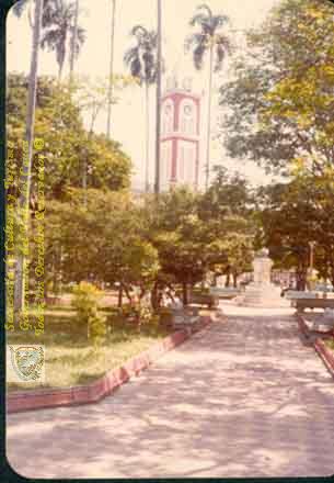 ALFREDO RUIZ (1985). Parque principal e iglesia de Bugalagrande, 1985 & 101418. BUGALAGRANDE: Biblioteca Departamental Jorge Garces Borrero.