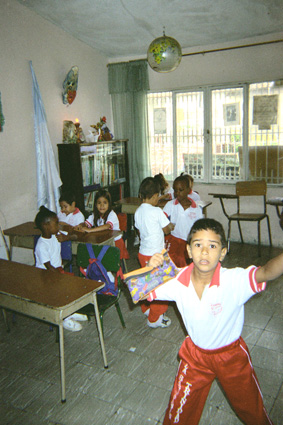 Imagen tomada en el interior de un colegio. Donde se puede apreciar el plano medio de un salón de clases, en el que hay algunos niños reunidos. Al extremo inferior derecho un niño mira hacía la cámara, tiene sus brazos extendidos y sobre él se refleja la luz del flash. Al fondo algunos escritorios y niños sentados.