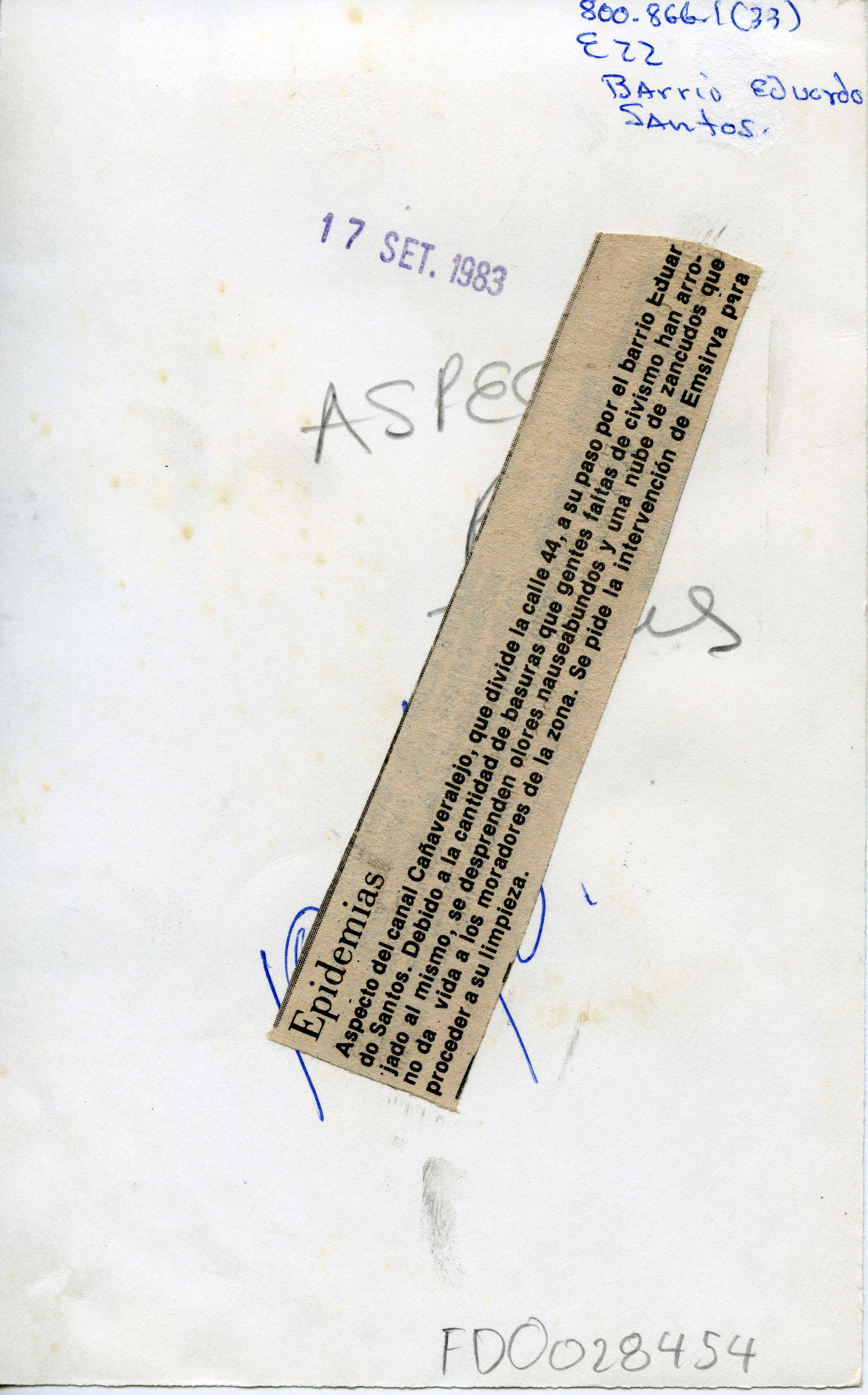 Reverso:"Epidemias. Aspecto del canal Cañaveralejo, que divide la calle 44, a su paso por el barrio Eduardo Santos. Debido a la cantidad de basura que gentes faltas de civismo han arrojado al mismo, se desprenden olores nauseabundos y una nube de zancudos que no da vida a los moradores de la zona. Se pide la intervención de Emsirva para procede a su limpieza."