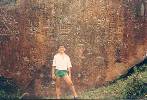 Pablo Fernández (1980). Ruben Dario Ramírez posando frente a una roca con pictogramas prehispánicos encontrados en la Reserva Forestal de Yotoco & 603760. YOTOCO: Biblioteca Departamental Jorge Garces Borrero.