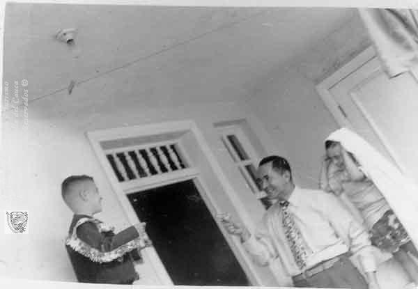 El peluquero Ignacio Zamora Castaño y los hermanos Palencia. Cali, barrio Granada, 1952.