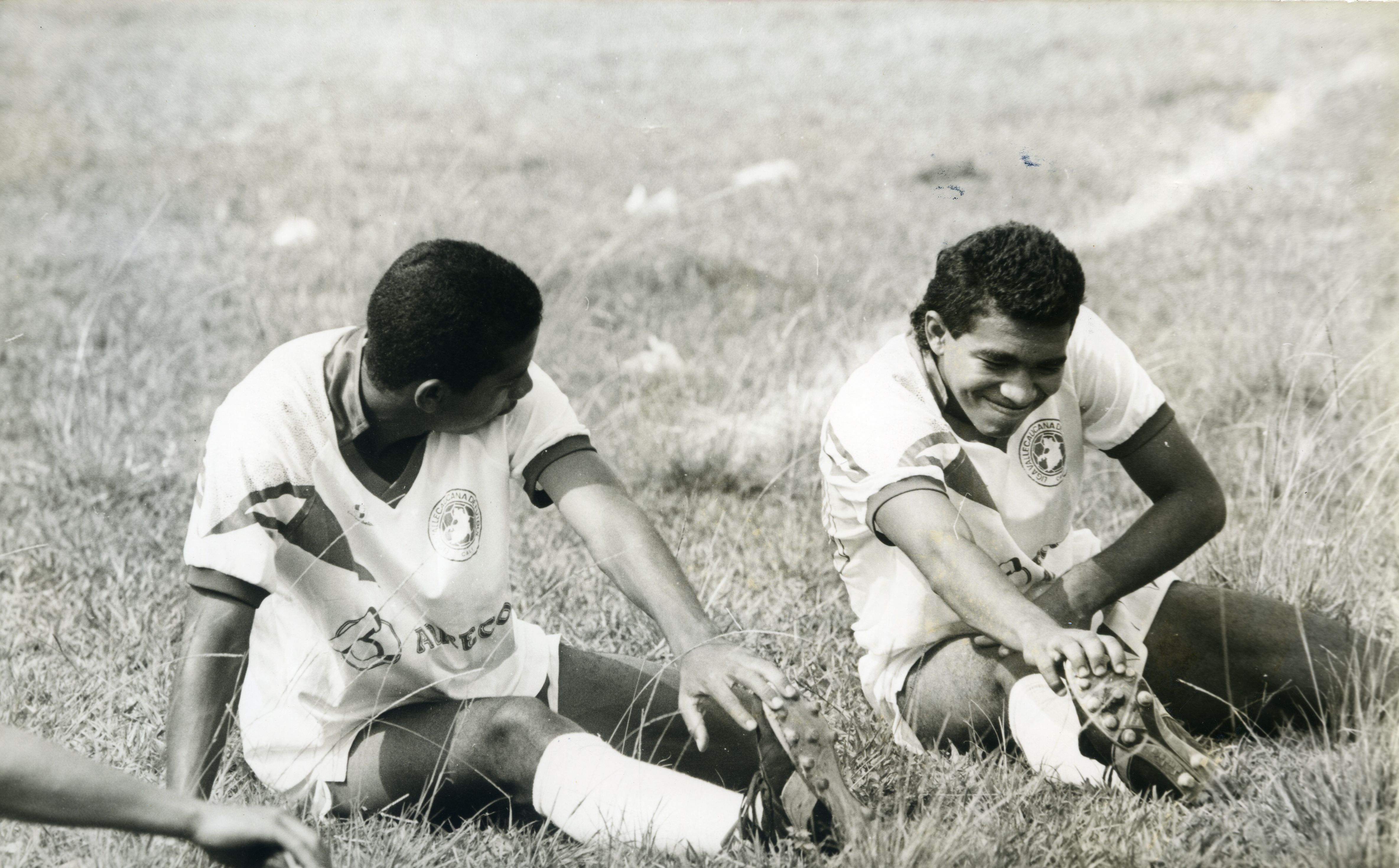 Integrantes de la Selección Valle sub-23 de fútbol de 1994, equipo de fútbol aficionado del departamento del Valle del Cauca. Observamos dos jugadores en sesión de entrenamiento