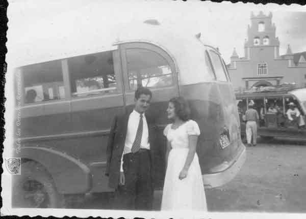 Violet Lozano y amigo, de paseo a Ricaurte, al fondo la Iglesia del Ecce Hommo patrono de Ricaurte y los buses de transporte público. Ricaurte, 1952.